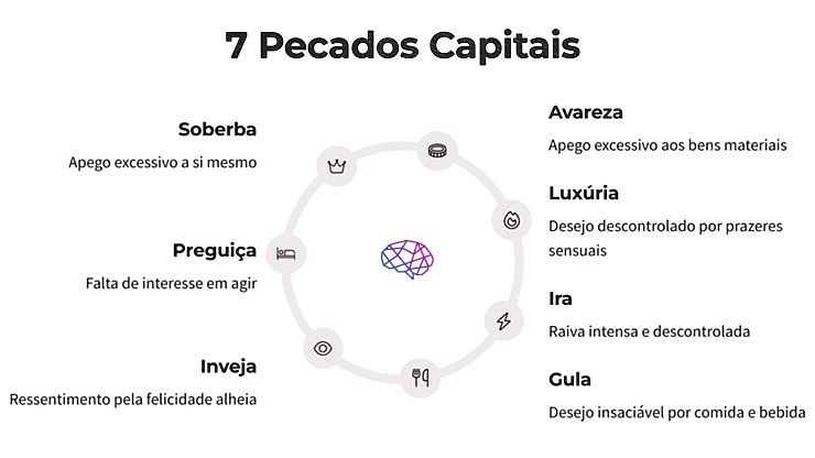 A Igreja Católica utilizou por muitos séculos o ensinamento sobre os 7 Pecados Capitais, que buscavam explicar ao ser humano as inclinações naturais e os problemas de se deixar levar por tais desvios de rota. A rota, aqui, é o caminho pré-estabelecido por Deus. Desviar-se do caminho seria não seguir o chamado divino em relação a si mesmo.